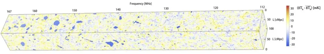 通过21厘米谱线强度展示宇宙在某个方向上的演化(基于模拟数据)。图片来自ZHAO X, MAO Y, CHENG C, WANDELT B D. Simulation-Based Inference of Reionization Parameters from 3D Tomographic 21cm Light-cone Images [J]. The Astrophysical Journal, 2022, 926(2): 151