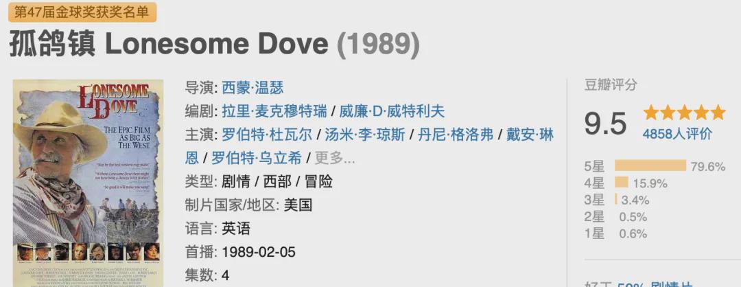 这剧只有四集,1989年播出,却被很多影迷封为「西部剧天花板」,豆瓣9.5分,改编自普利策奖小说,含金量拉满。