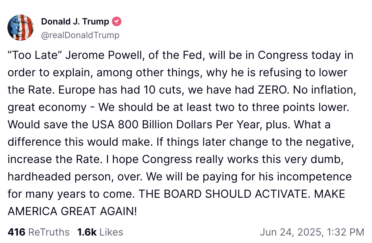 特朗普再度喊话鲍威尔:应降息至少2到3个百分点特朗普再度喊话鲍威尔:应降息至少2到3个百分点
