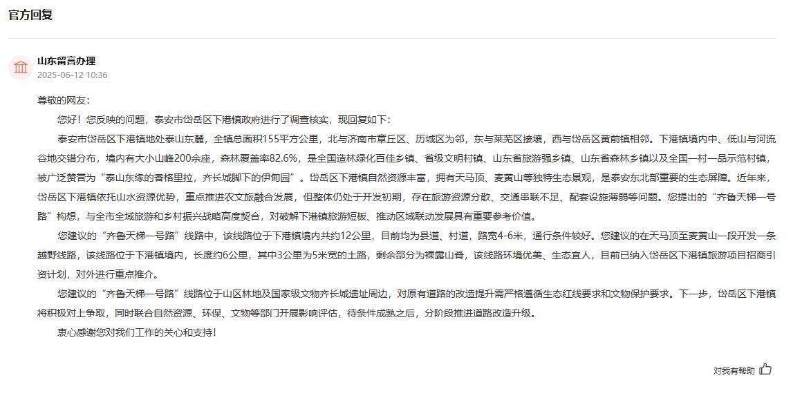 对于网友提出的具体建议,下港镇政府进行了详细调查核实。建议线路在下港镇境内约12公里,现有道路均为县道、村道,路宽4-6米,整体通行条件良好。建言中提到天马顶至麦黄山段开发越野线,位于下港镇境内长度约6公里,包括3公里5米宽的土路和部分裸露山脊,该段环境优美、生态宜人,已被纳入岱岳区下港镇旅游项目招商引资计划,正在对外重点推介。