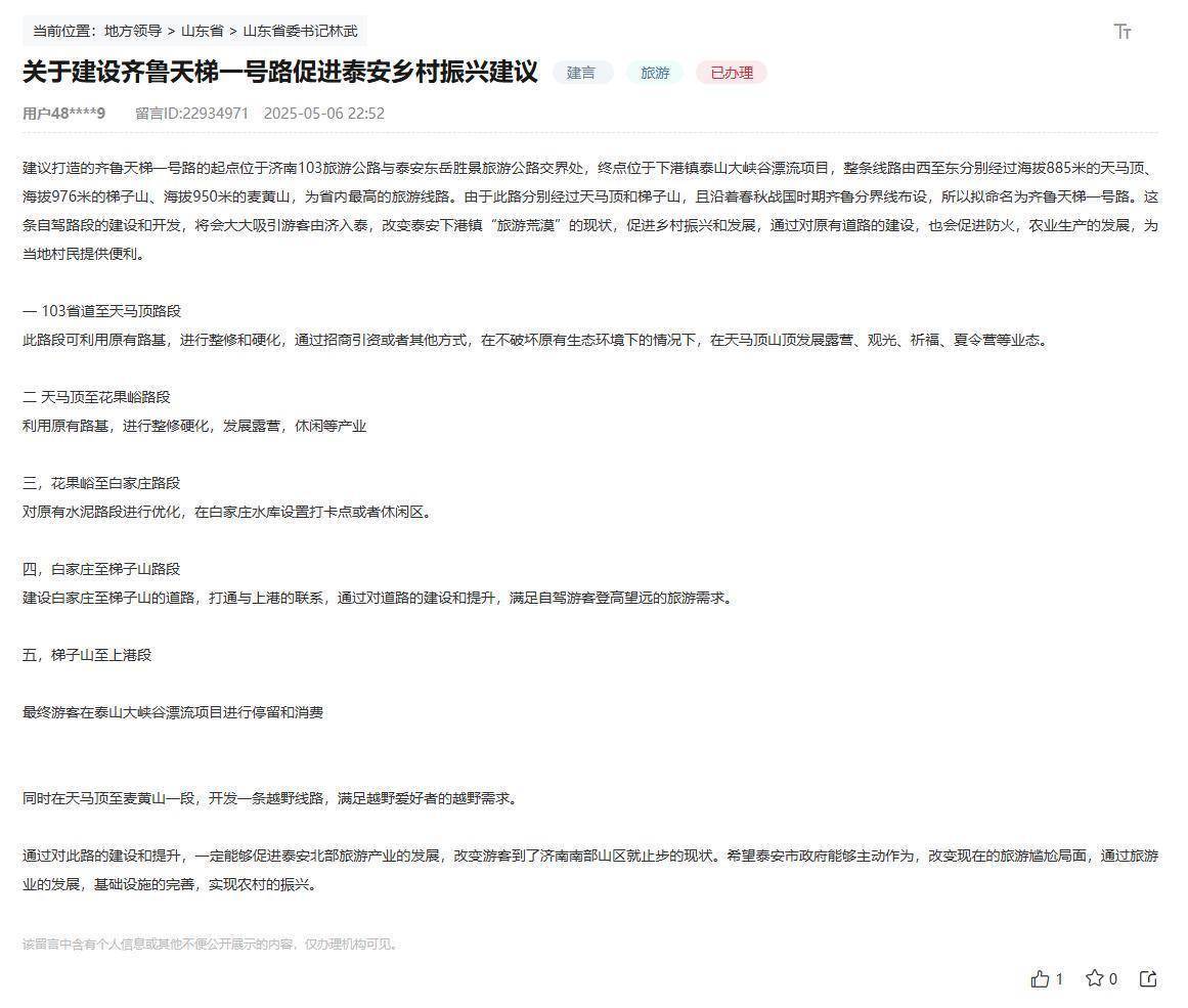 近日,有网友在人民网“领导留言板”留言,建议充分挖掘沿线丰富的自然与人文资源,规划打造“齐鲁天梯一号路”,建设一条集生态观光、文化体验于一体的特色旅游线路,为乡村振兴注入新活力。