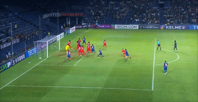 第87分钟,明天右路传中,李圣龙头球攻门顶偏