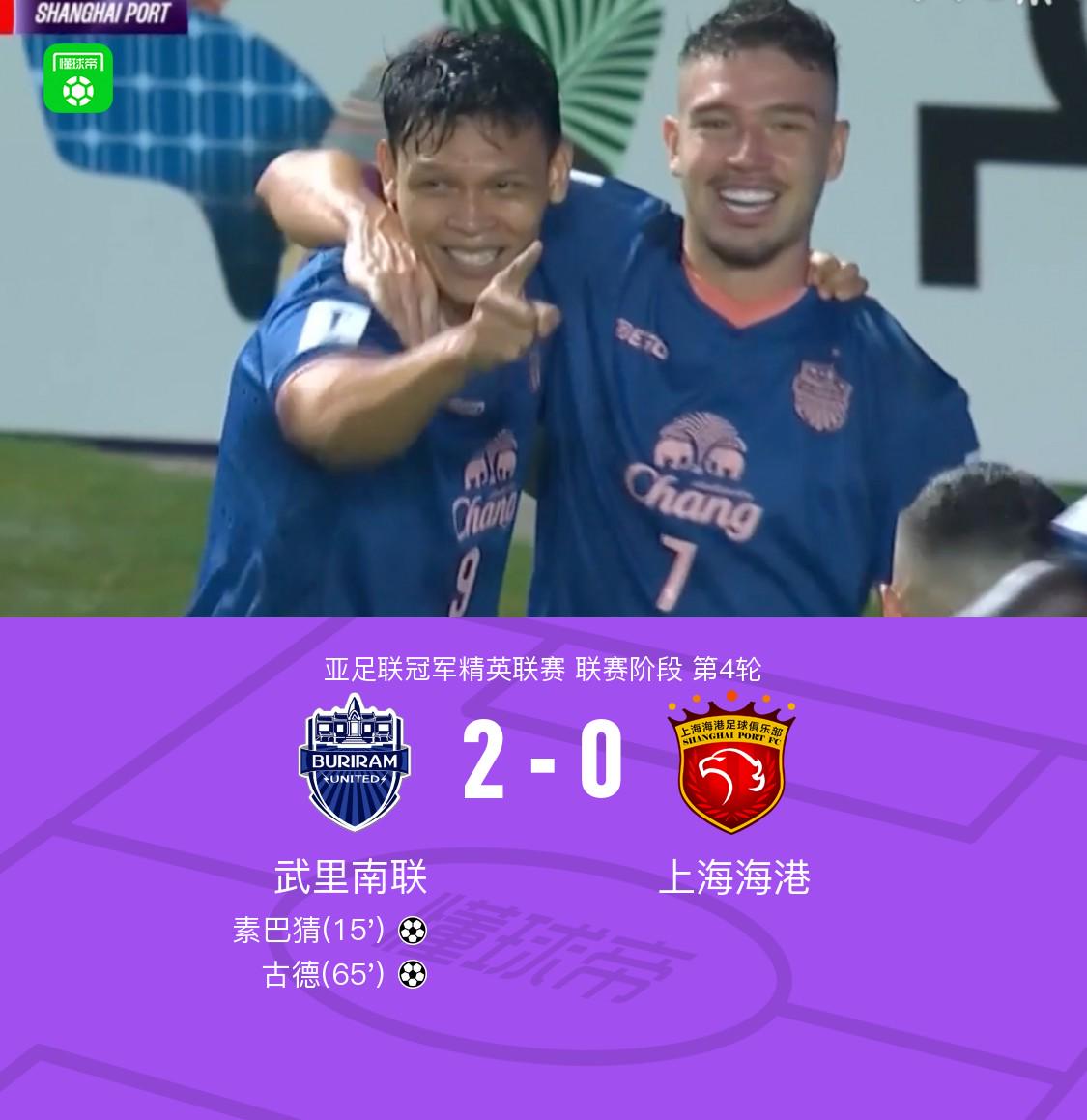 北京时间11月4日20:15,亚冠精英赛联赛阶段第4轮双悦网,上海海港客场挑战武里南联。素巴猜推射破门先拔头筹,古德打进空门扩大领先。李圣龙、王燊超接连头球制造威胁,但海港最终没能取得进球,0-2不敌武里南联,4轮比赛仅得1分,继续垫底。